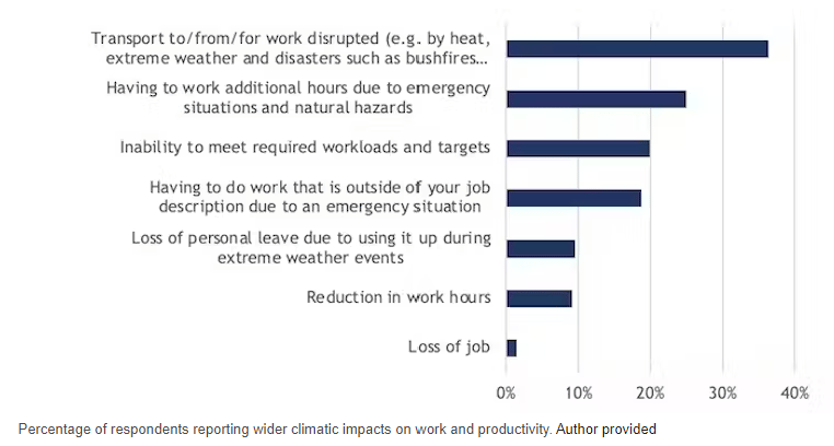 Studies have found climate-induced sick days are on the rise including from extreme heat and wildfires in Australia and North America. Absentee days are also increasing due to climate-induced transport disruption e.g. flooding, heatwaves and snow. Not to mention the impact of climate crisis on mental health.